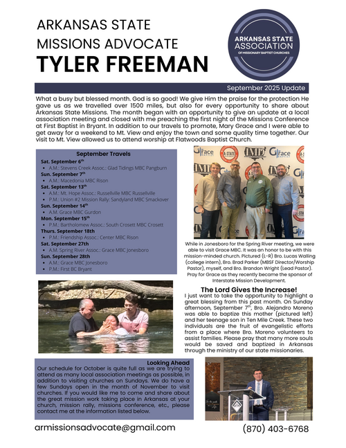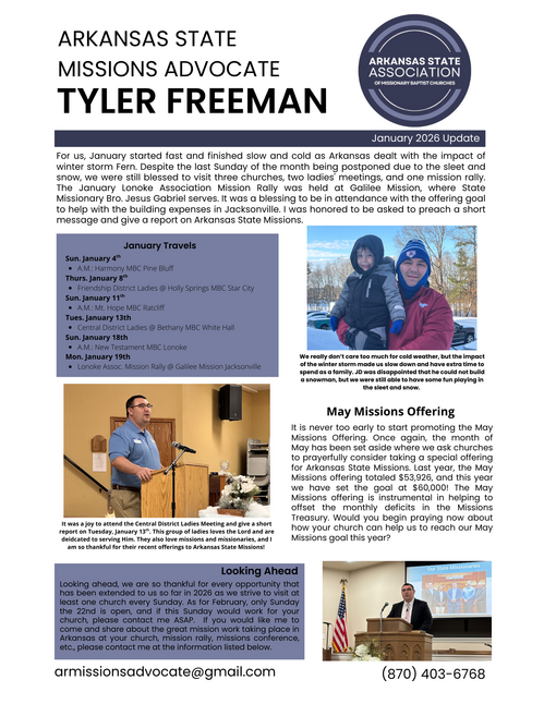 I count it an honor and a privilege to serve the churches of the Arkansas State Association as the State Missions Advocate. If I can ever answer a question, be of assistance to you or your church, or if you would like me to come and present the work of Arkansas State Missions, please reach out to me at the contact information listed on the below report.